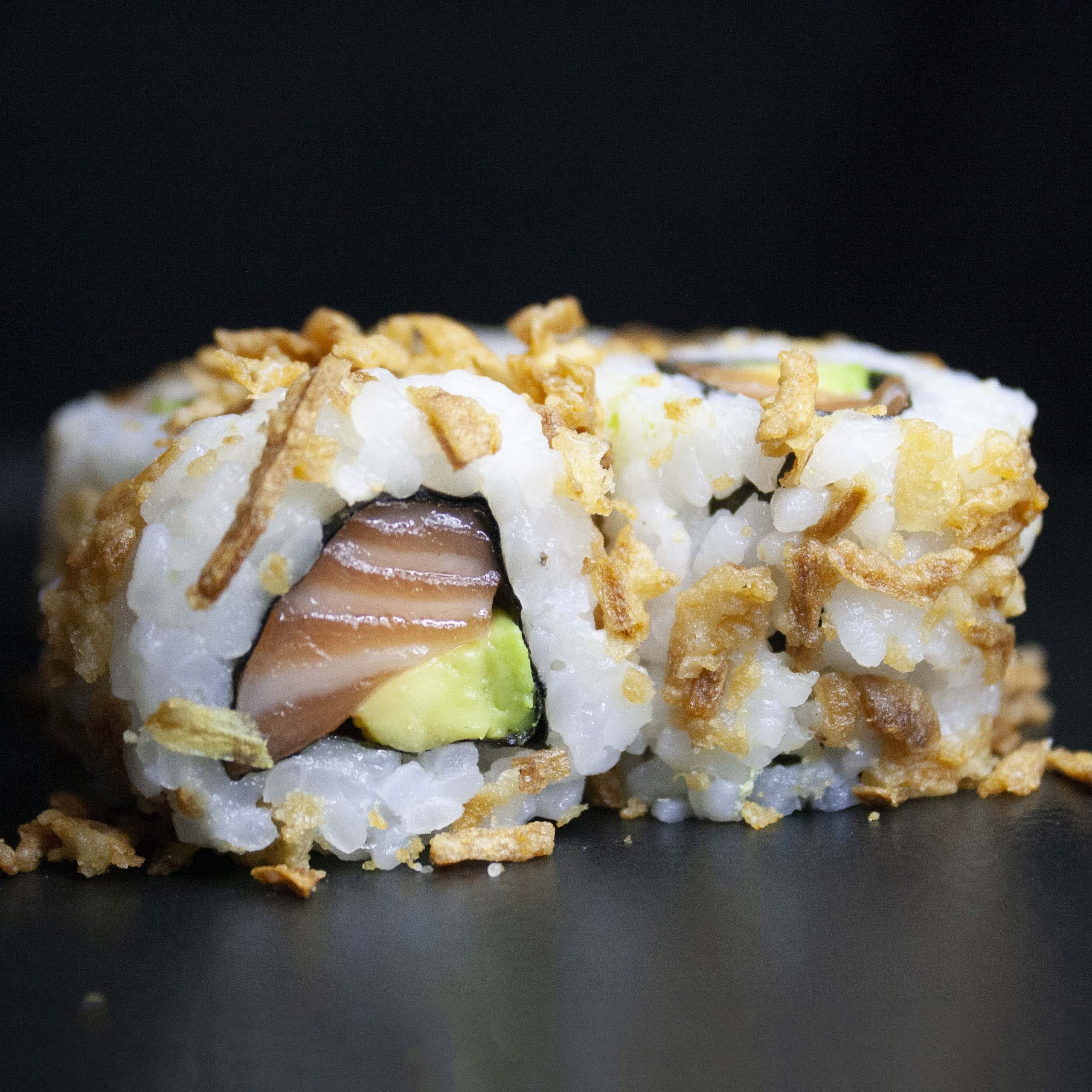 Saumon, avocat, enrobé d’oignons frits