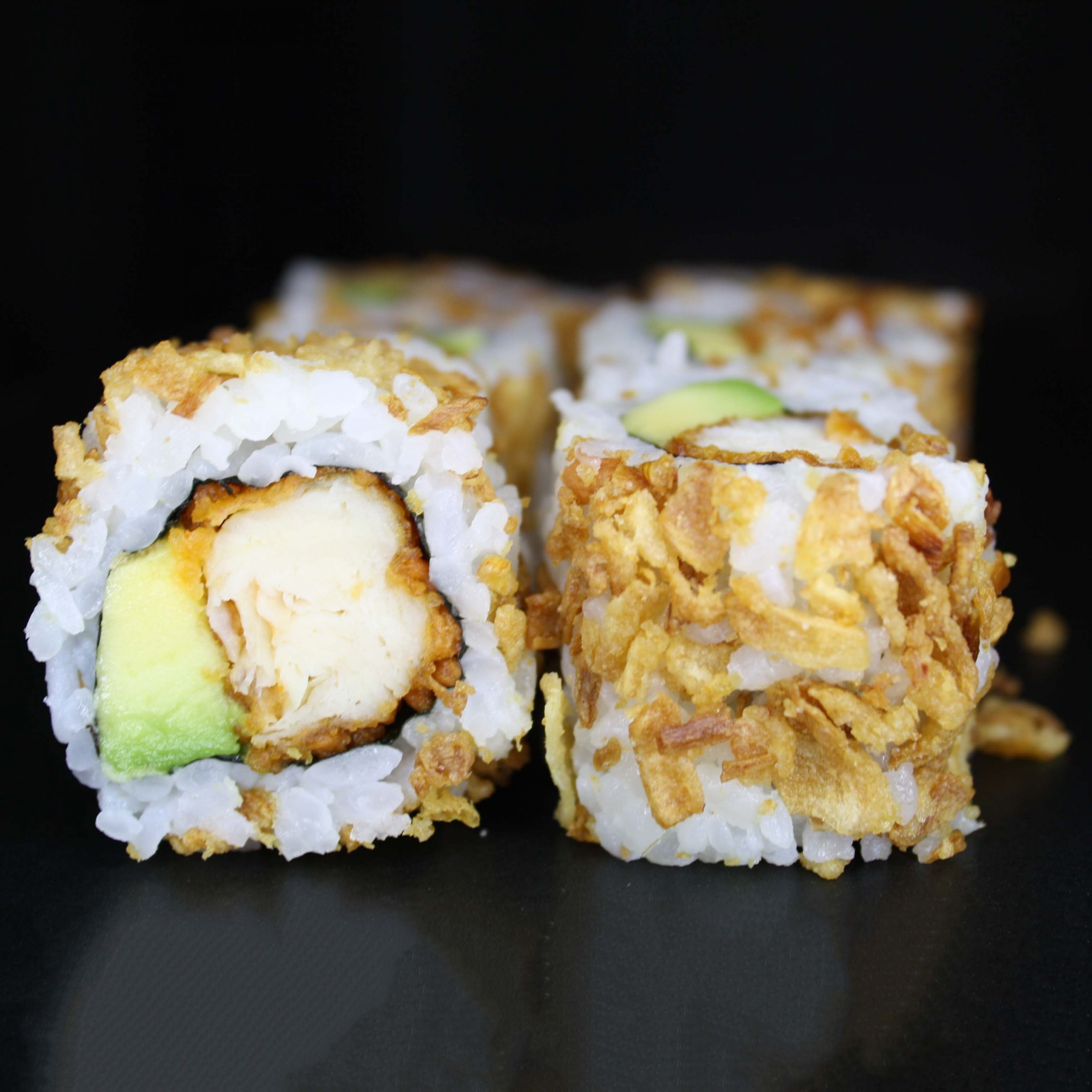 Poulet frit, avocat, enrobé d’oignons frits